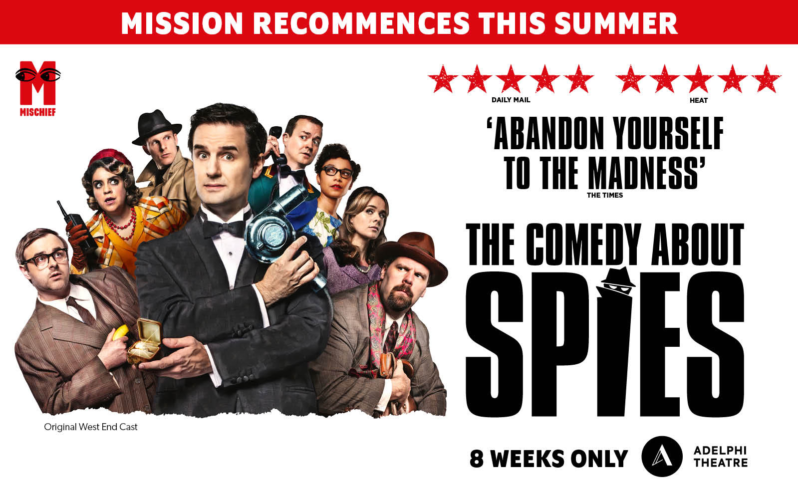 Mischief’s most critically acclaimed adventure, The Comedy About Spies, is back, ‘bigger, better and more brilliantly bungling than ever’ (Daily Mail), with a limited 8-week mission recommencing this summer in London’s West End at the Adelphi Theatre.
